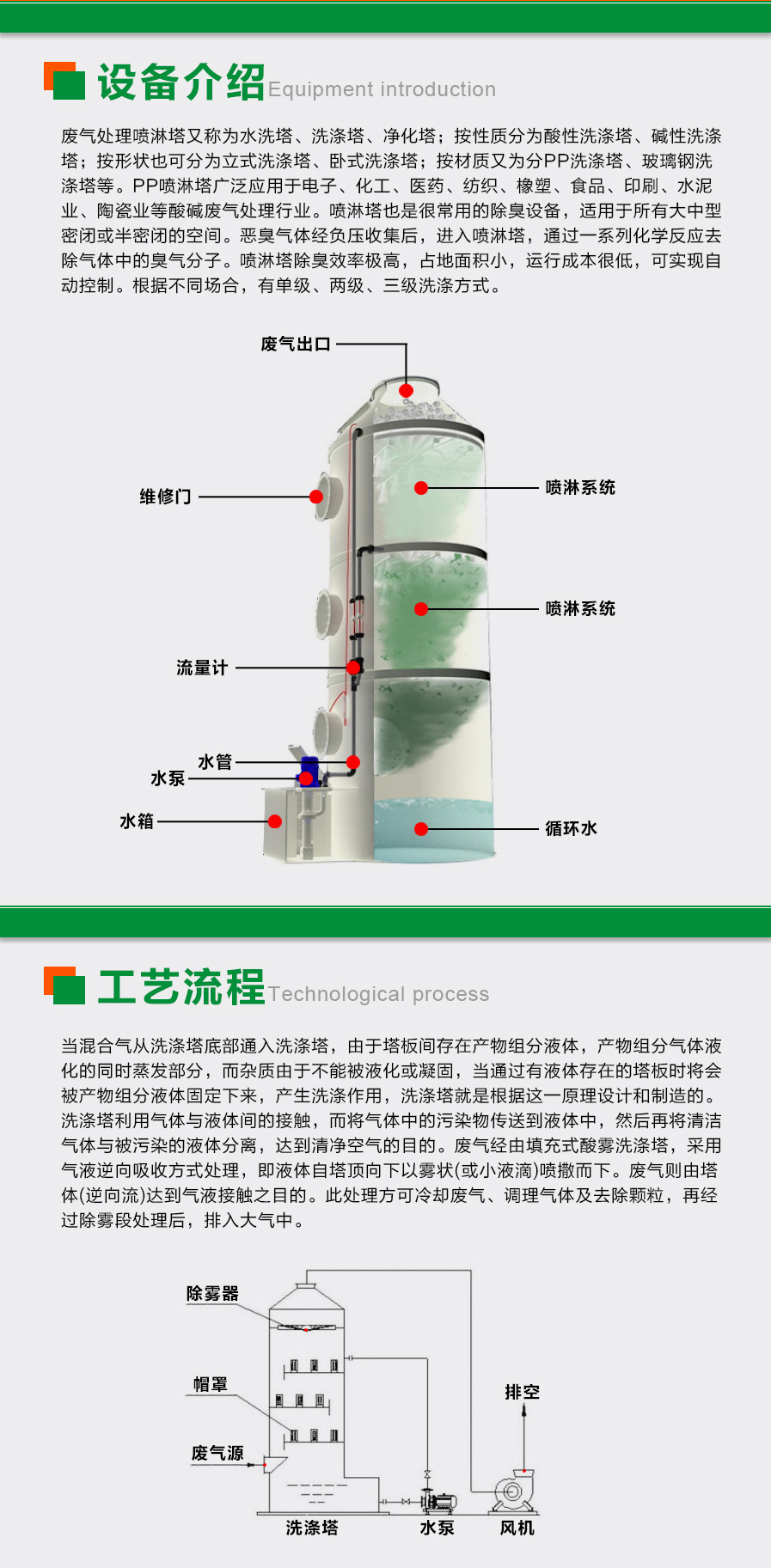 噴淋塔(俗稱:水淋塔)是一種處理煙塵廢氣的濕式環(huán)保設(shè)備,可適用于發(fā)電廠燃燒煙塵、鋼鐵廠、鍋爐燃燒、垃圾燃燒等煙塵廢氣處理,這類的煙氣粉塵容易溶于水,噴淋塔是處理這類煙氣粉塵的不二之選。煙氣粉塵從塔底進入塔內(nèi),塔內(nèi)有填料支撐板,噴淋塔從塔頂噴出液體,液體均勻的分布在塔內(nèi)和污染物充分接觸,達到凈化的效果,最后塔頂排出。