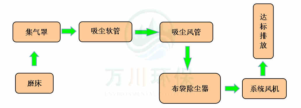 磨床生產時產生的粉塵通過集氣罩、吸塵軟管進入到脈沖布袋除塵器中過濾凈化,粉塵落入灰斗,凈化后的廢氣通過系統風機達標排放。