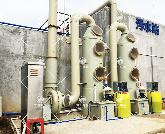 該污水站的廢氣主要成分是硫化氫和氨氣,該兩種氣體水溶性比較強。首先經(jīng)過一級吸收塔,該吸收塔的吸收劑為氧化劑(次氯酸鈉)。氧化廢氣中的硫化氫和氨氣,之后經(jīng)過二級氧化塔進(jìn)行酸堿中和(氫氧化鈉),最后經(jīng)過三級吸收塔,以清水為吸收劑,最后達(dá)標(biāo)排放。